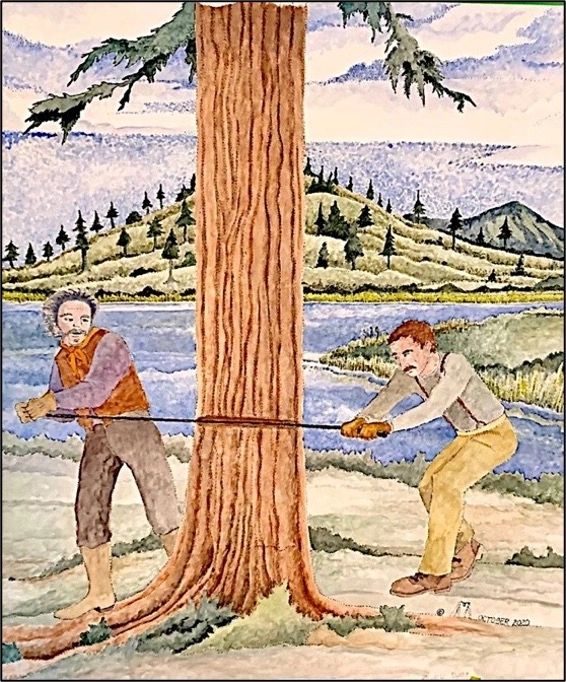 COLONEL ZEBEDIAH ROGERS AND ALVY BOLES SAWING DOWN A TREE